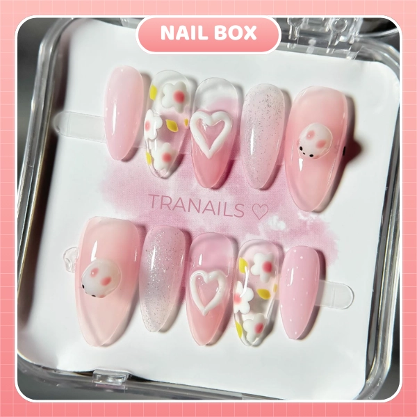 Bộ nail box tone hồng pastel kết hợp hiệu ứng nhũ nhẹ, họa tiết tim nổi và hoa nhỏ tạo cảm giác mềm mại, ngọt ngào và trong trẻo.