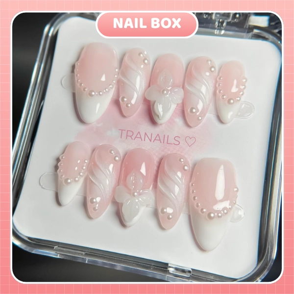 Bộ nail box tone hồng sữa nhẹ nhàng kết hợp vân nổi và hoa 3D, điểm nhấn đính bi tạo cảm giác nữ tính, mềm mại nhưng vẫn sang.