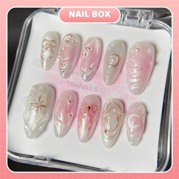 Bộ nail box tone trắng ngọc trai kết hợp hồng nhũ và hiệu ứng ánh xà cừ, điểm nhấn họa tiết vỏ sò, sao biển, ngọc trai và charm nổi, tạo cảm giác sang trọng nhưng vẫn nhẹ nhàng.