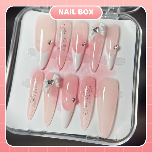 Bộ nail box tone hồng sữa kết hợp french trắng nhẹ và nhũ mịn, điểm nhấn nơ nổi và đá nhỏ tạo cảm giác nữ tính, nhẹ nhàng nhưng vẫn sang.